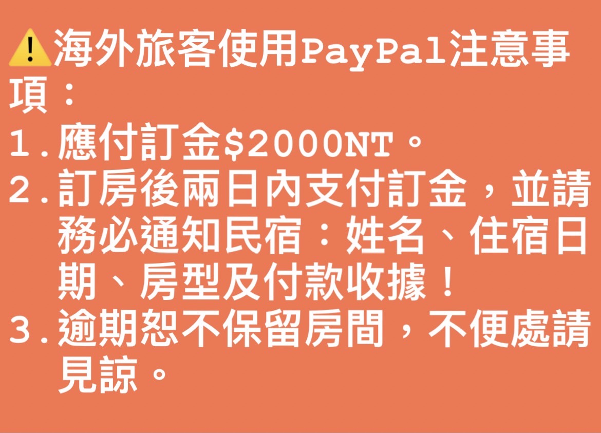 訂房確認後,請於三日內預付房價五成之訂金,逾期恕不保留客房,不便處請見諒。